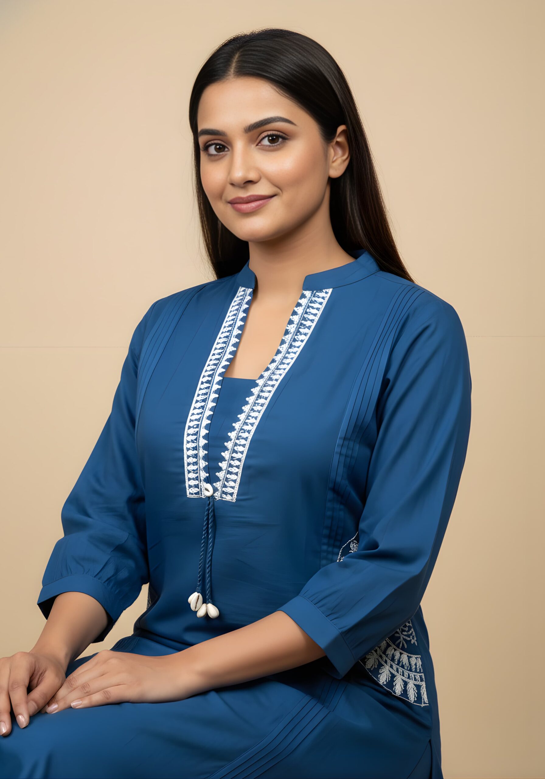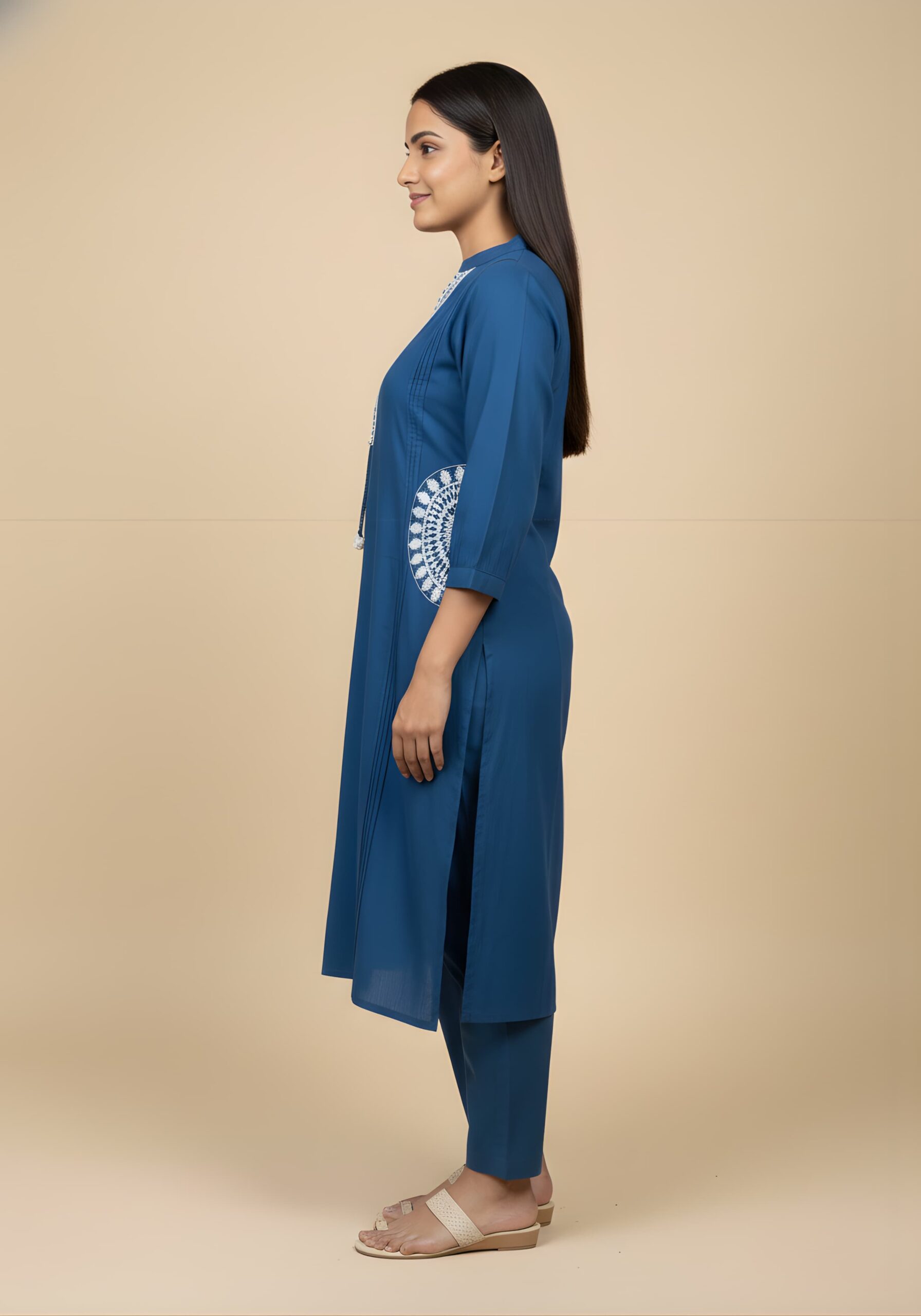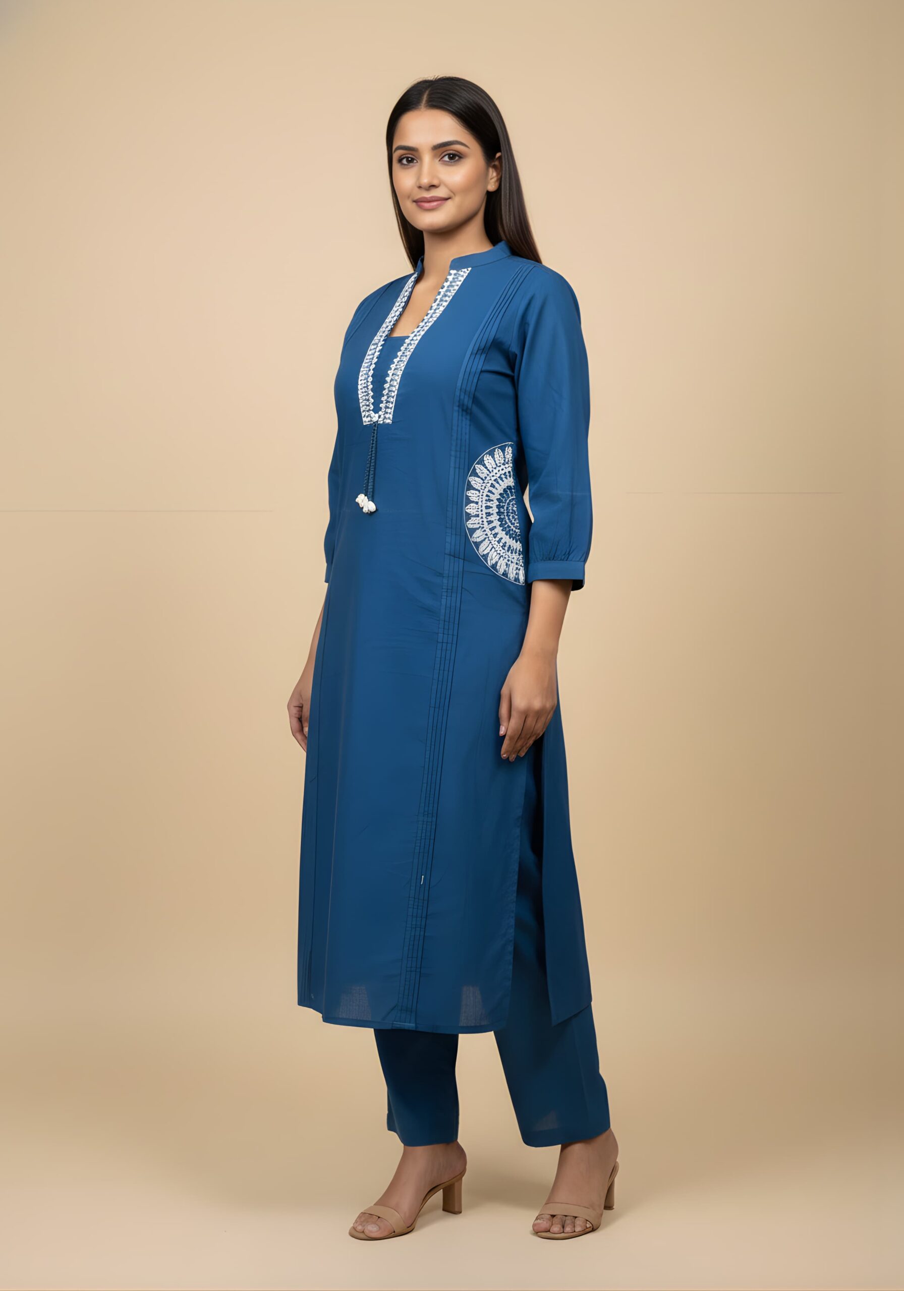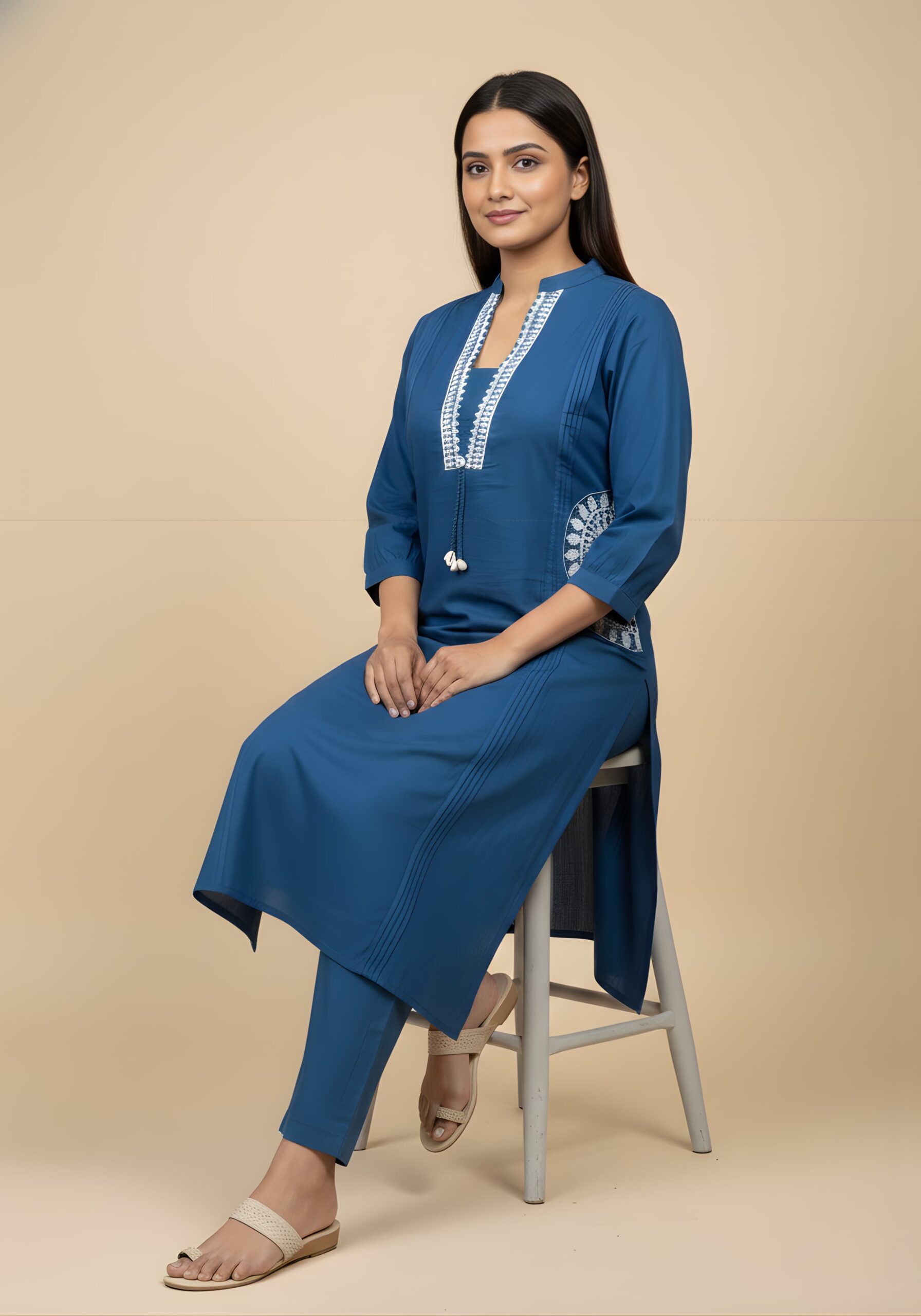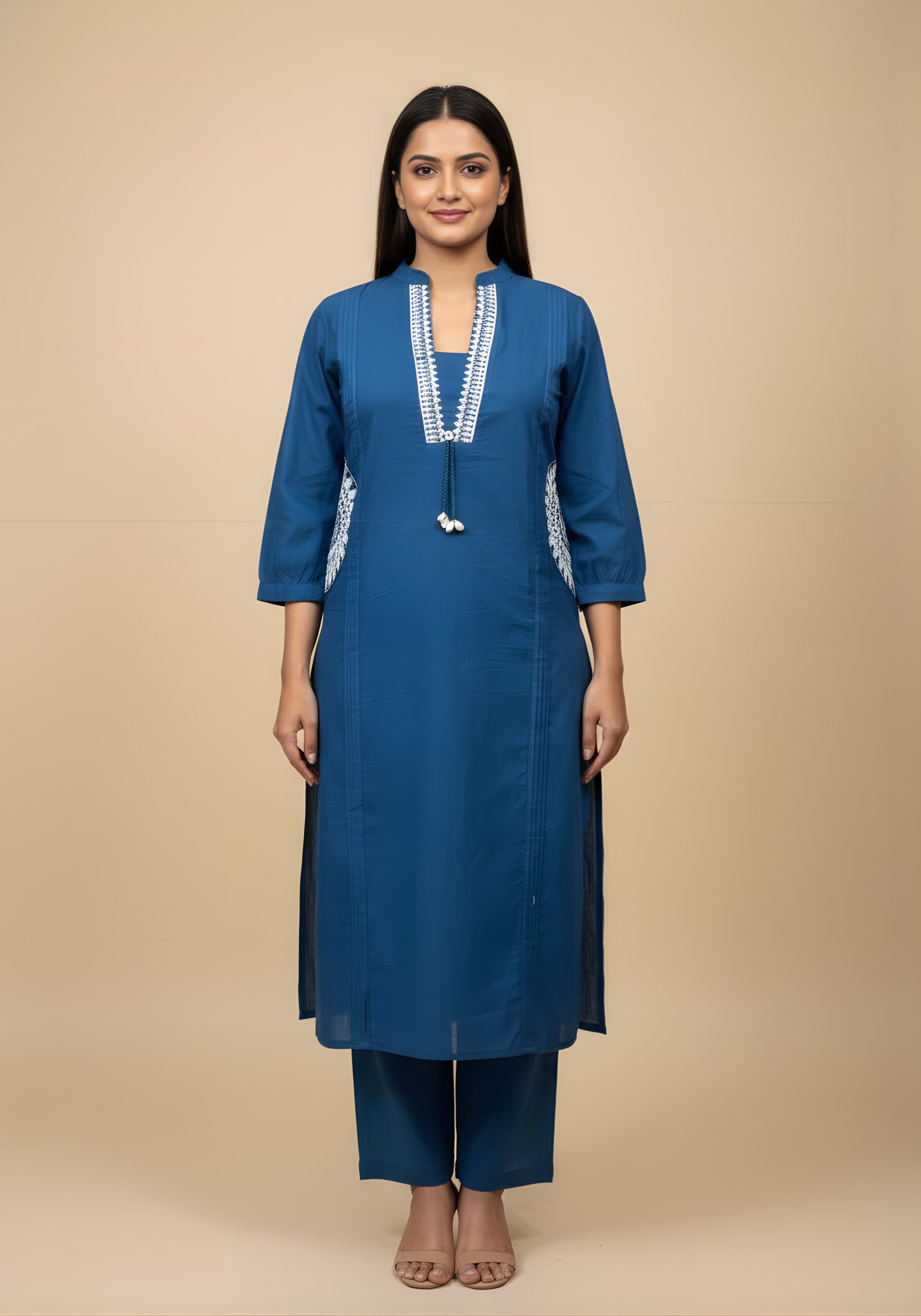 A beautifully embroidered  blue color cord set for office wear that adds a touch of nature and elegance to your everyday style. Designed for working women having look of formal cord set for women. Blue color cotton cord set offers a polished and comfortable option for office wear. The V-neckline with delicate lace detailing enhances its refined, feminine appeal. Perfect for casual outings too, this blue co-ord set for women brings effortless charm to any look. Cord set for summer available in M to 3Xl Under 1000 INR.