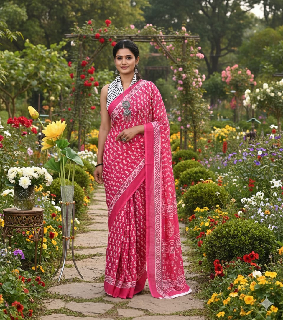 Classic Pink mulmul block printed cotton saree