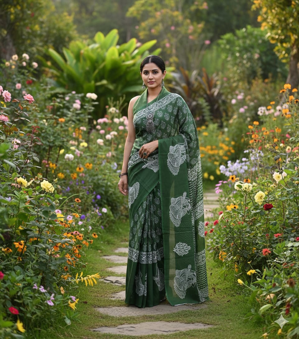 White Block Printed Pure Mulmul Cotton Saree