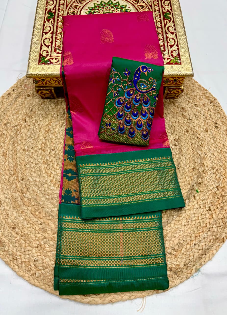 Elegant pink Kadiyal Paithani saree in soft silk with intricate zari weave and timeless traditional charm.