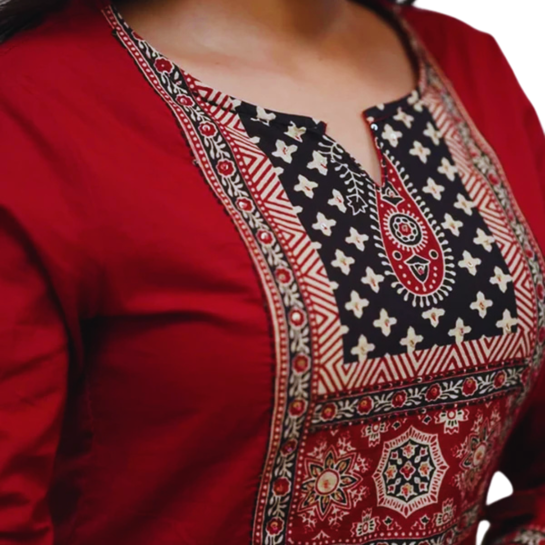 Elevate your festive and party look with this elegant A-line Kurti Set, crafted from soft and breathable cotton fabric. Designed in a graceful calf-length silhouette, the kurti features a classic round neck and stylish three-quarter sleeves for all-day comfort. The traditional Ajrakh print adds a timeless charm, while the black mulmul dupatta enhances the overall ethnic appeal. Paired with comfortable pants, this kurti set is perfect for party wear, festive gatherings, and special occasions. A versatile ensemble that blends tradition with modern elegance.